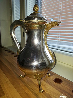 Espoolaisen seurakunnan ehtoolliskannun sarana korjattiin ja sekä kannu että parina ollut öylättiastia kiillotettiin ja puhdistettiin ehtoolliskäyttöön. Säännöllinen huolto, tarkistus ja tarpeelliset kunnostukset pidentävät hopeaesineiden käyttöikää. Meiltä saatte hopeaesineille ajanmukaiset hoito-ohjeet.